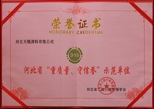 我公司先后榮獲 "河北省第五、六、七屆消費者信得過單位"、省級"食品安全先進企業"、省農行"AA級信用客戶";我公司是河北省調味品行業擁有五個"河北名牌"和二件"河北省著名商標"的企業標"的企業